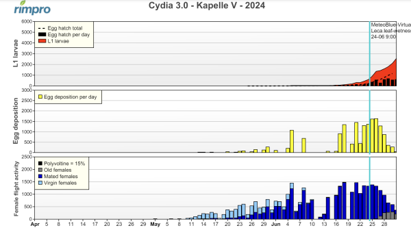In mei zijn de eerste fruitmotten in de feromoonvallen gevangen. Door het koele weer waren de vangsten de laatste weken relatief laag. We verwachten nu met het warme weer een piek in de vlucht van fruitmot en ook ei-uitkomst. Zie grafiek Cydia van vandaag. Als u zelf de vlucht van de fruitmot volgt, is ons advies deze week de lijmbodems en de feromoondopjes te vernieuwen.