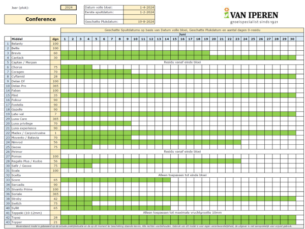 Verschillende gewasbeschermingsmiddelen geven een residu bij de oogst. Soms is dit gewenst, zoals bij de fungiciden in het afspuitschema, maar meestal kiezen we nu een middel wat geen residu geeft. Verschillende supermarktketens geven aan; maximaal vier stoffen op het fruit. Figuur 1 toont een overzicht, welke middelen u in juni nog kunt toepassen, zonder residu bij de oogst. We gaan hierbij uit van start pluk op 19 augustus. Groen betekent in deze figuur, volgens onze informatie, geen residu bij de oogst. Voor meer informatie, kijk op onze digitale fruitgids fruitgids-middelenoverzicht-pitfruit Figuur 1: