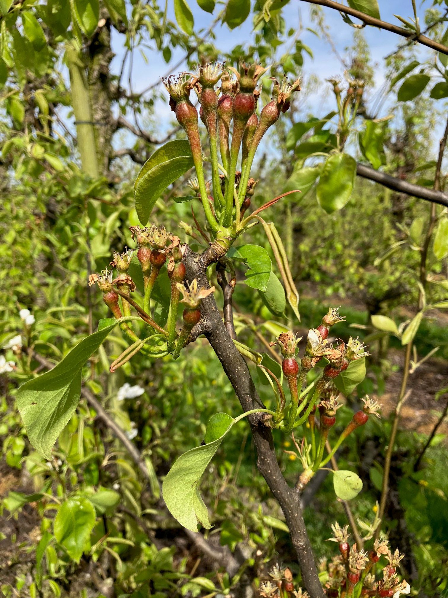 Bij peer zitten we nu in het stadium ruim drie weken na volle bloei. In deze periode speelt het risico op infectie van verschillende schimmels. Naast perenschurft, is ook de bestrijding van Alternaria-dode knop en Stemphylium-zwartvruchtrot belangrijk in deze fase. Voor deze week voorspelt het KNMI nog vrij lage temperaturen. Stemphylium gaat vooral spelen, als de temperatuur omhoog gaat, gecombineerd met regenperioden.