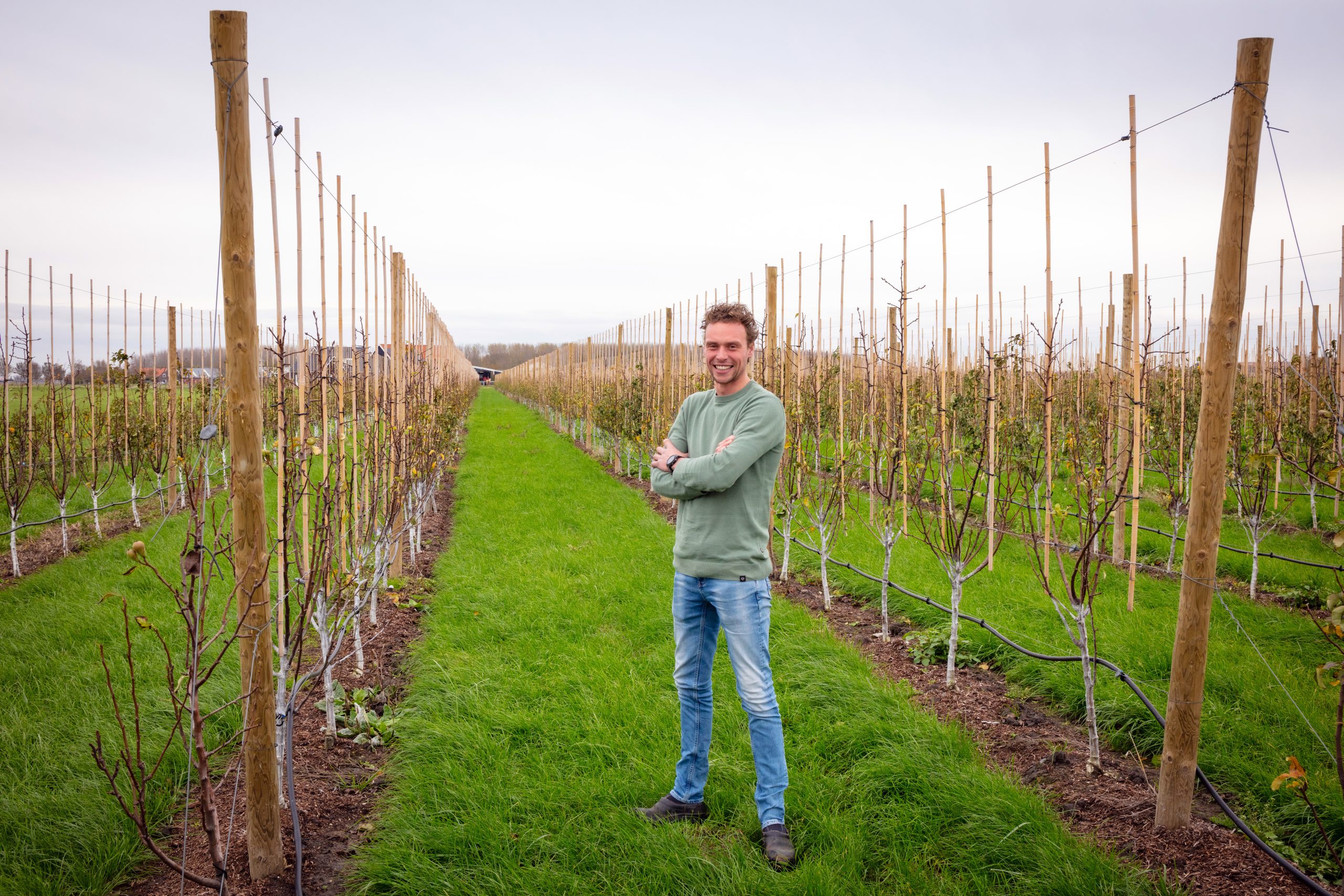 Wat begon met een paar hectare huurgrond, groeide uit tot een bedrijf van acht hectare. In oktober 2024 kocht hij zijn eigen erf met vier hectare huiskavel. “Die locatie was perfect. De kas die erop stond, werd door de verkoper meegenomen.” Inmiddels is er op eigen grond een hectare peren aangeplant; de rest wordt verhuurd als grasland. “Eerst moet er verdiend worden. Aanplanten kost veel geld. Eén perenboom kost vijf tot zeven euro en je hebt er drieduizend nodig voor een hectare. Dan heb je nog geen paal, slang of arbeid meegerekend.” Het plan is helder: doorgroeien naar 15 hectare, in eigen beheer. “Bij droomvang hoef ik niet meer buitenshuis te werken. Haast heb ik niet. In deze regio komt er af en toe iets vrij en de grondprijs is nog acceptabel.”