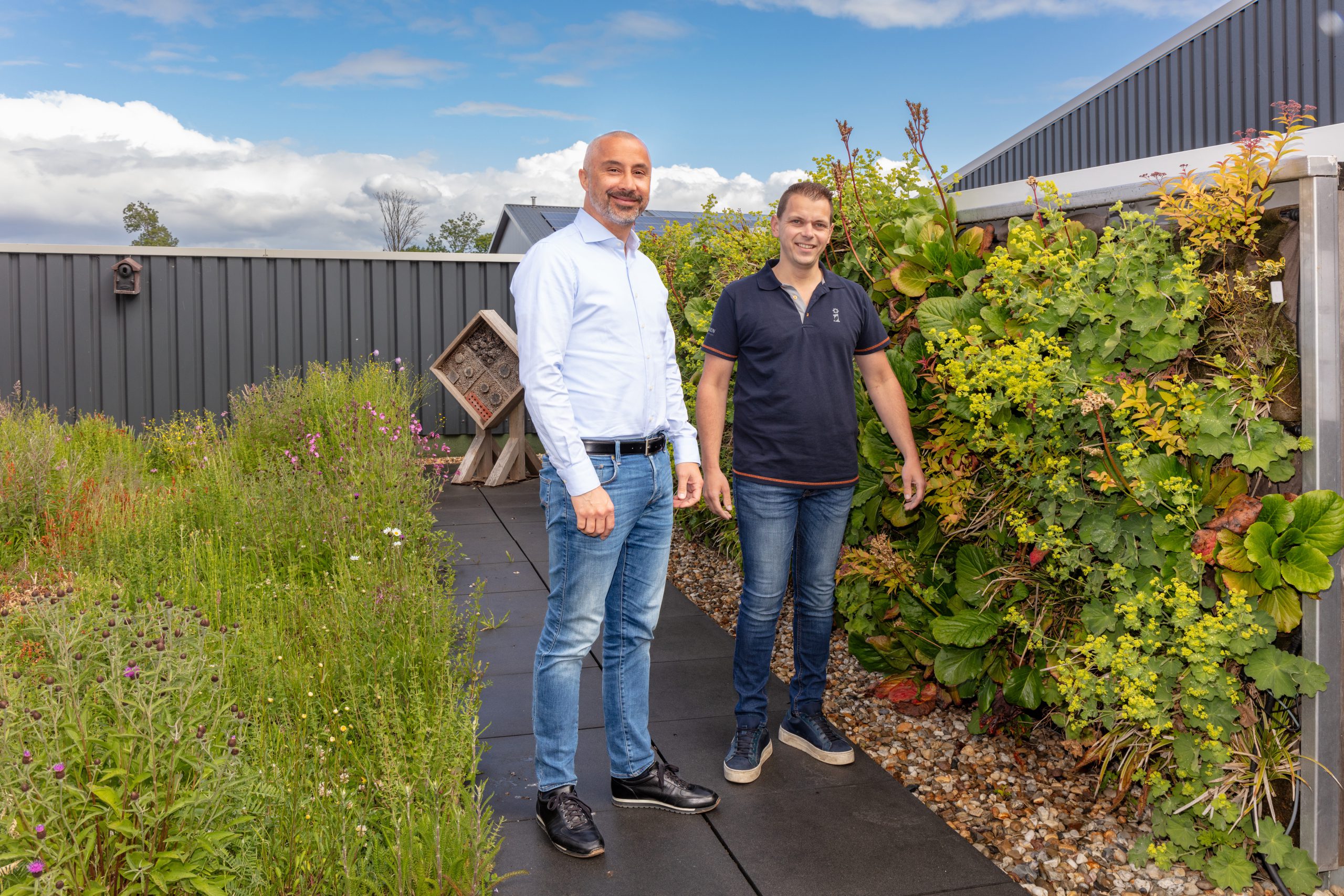 De gevel van het hoofdkantoor in Odijk is een mooi voorbeeld: hij trekt talloze insecten en vogels aan. Zelfs de groenling en de distelvink nestelen er. “We snoeien jaarlijks, vervangen waar nodig dominante soorten en zorgen dat de geveltuin in balans blijft.” Daktuinen daarentegen worden meestal aangelegd door externe partijen. Sempergreen levert het product en biedt ondersteuning, maar is zelf geen uitvoerende partij.