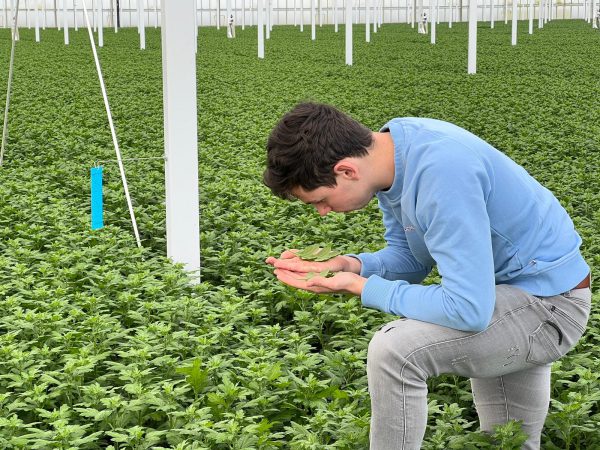 Chris zit in het laatste jaar van de opleiding Tuinbouw & Agribusiness van Hogeschool Inholland in Delft. “Om af te studeren moet ik een kwantitatief onderzoek uitvoeren. Ik mocht zelf de keuze maken welke kant ik op wilde. Ik wist dat ik graag iets met biologische gewasbescherming wilde doen. Bij Van Iperen lag dit onderzoek al klaar om uitgevoerd te worden. Uiteindelijk heb ik dan ook gekozen voor een stage bij Van Iperen.” Bijkomend voordeel is dat de chrysantenteelt niet vreemd is voor Chris. Zijn vader teelt namelijk chrysanten en asters. “Hierdoor wist ik al een beetje wat ik kon verwachten. Dat is wel makkelijk met bijvoorbeeld het uitzetten van de roofmijten.”