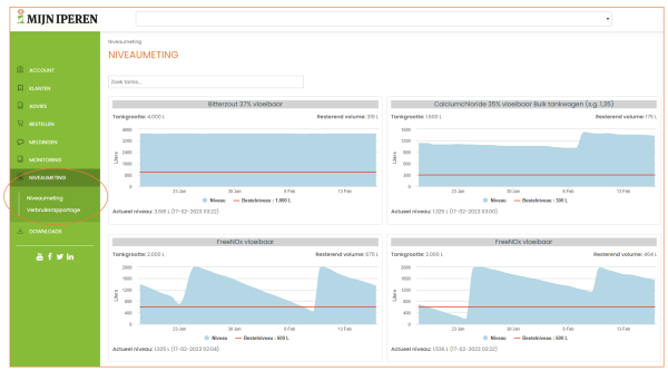 Als u vloeibare meststoffen van Van Iperen gebruikt, ziet u de optie niveaumeting in het menu. Met één druk op de knop krijgt u een overzicht van de niveaus van uw vloeibare meststoffen. U kunt een gewenst minimaal niveau per tank instellen en zodra de voorraad onder dat niveau komt, wordt er automatisch een order in ons systeem aangemaakt en komen wij uw tanks bijvullen.