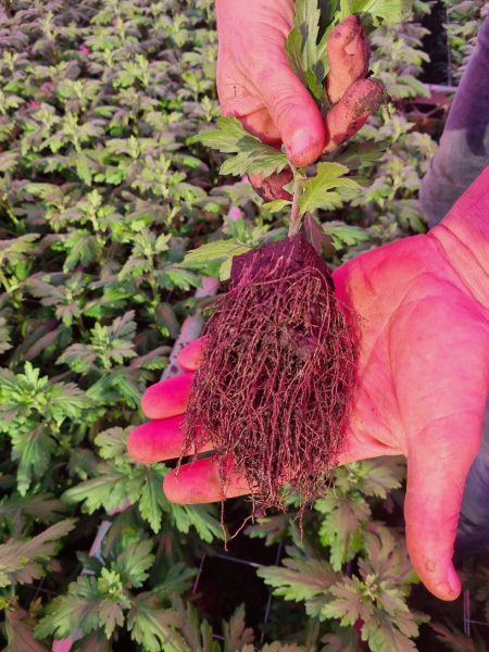 In 2021 is er gestart met deze proef in twee kappen. In eerste instantie met Nemater in granulaatvorm. Dat gaf niet direct het gewenste resultaat. Arjan waardeert de betrokkenheid van Sander en Willem tijdens het proces enorm. Ze keken nauwlettend mee en waar nodig werden er alternatieven geopperd. Sander: “In overleg besloten we om Nemater in vloeibare vorm in te gaan zetten en aanvullend Stimuter te gebruiken. Dat gaf resultaat in de vorm van meer (haar)wortels.” Een weerbaardere plant kan beter tegen stress en is minder aantrekkelijk voor aaltjes. De grotere wortelpruik was al snel zichtbaar. Dit is in de chrysantenteelt belangrijk; de teeltcyclus is kort en een goede start is cruciaal. Dan sta je 1-0 voor! Bij een minder goede wortelgroei gaat het sneller mis tijdens de teelt.